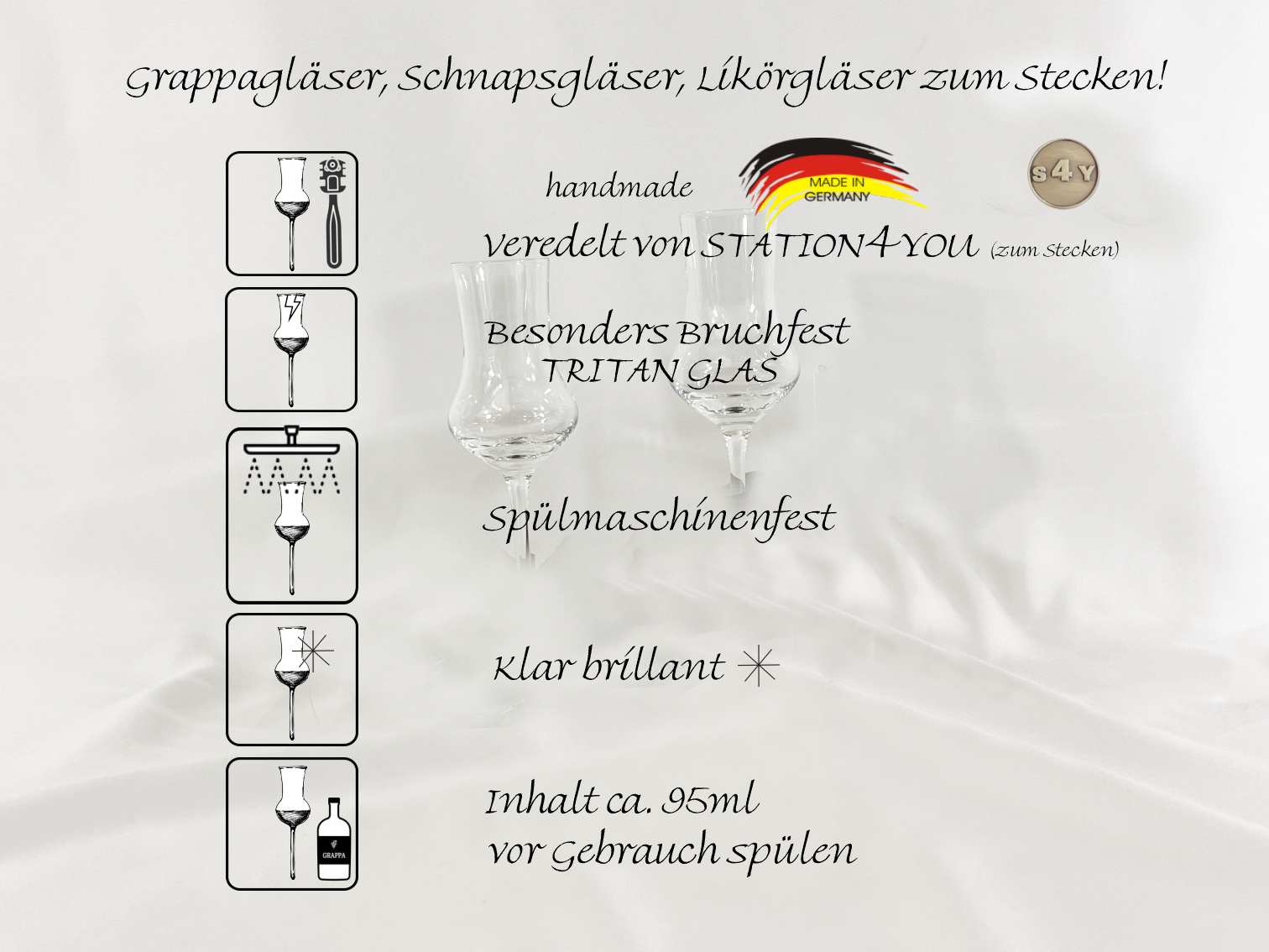 Grappaglas Schnapsglas Likörglas ohne Fuß zum Stecken Ein wunderschönes Grappa-Glas aus durchsichtigem Kristallglas ohne Fuß zum Stecken. Das sehr dekorative Kolbenglas ist ein wunderbares Accessoire und innovativer Hingucker für jeden Anlass und jeden Tisch oder Bar. Jedes K-Glas ein UNIKAT (handmade). Diese Art ist ein brillantes und sehr transparentes Kolbenglas, um die Farbe und den ursprünglichen Farbton von Grappa, Schnaps, Likör, Wodka, klare Obstbrände, Tresterbrände, Marc, Gin und Aquavit zu würdigen.