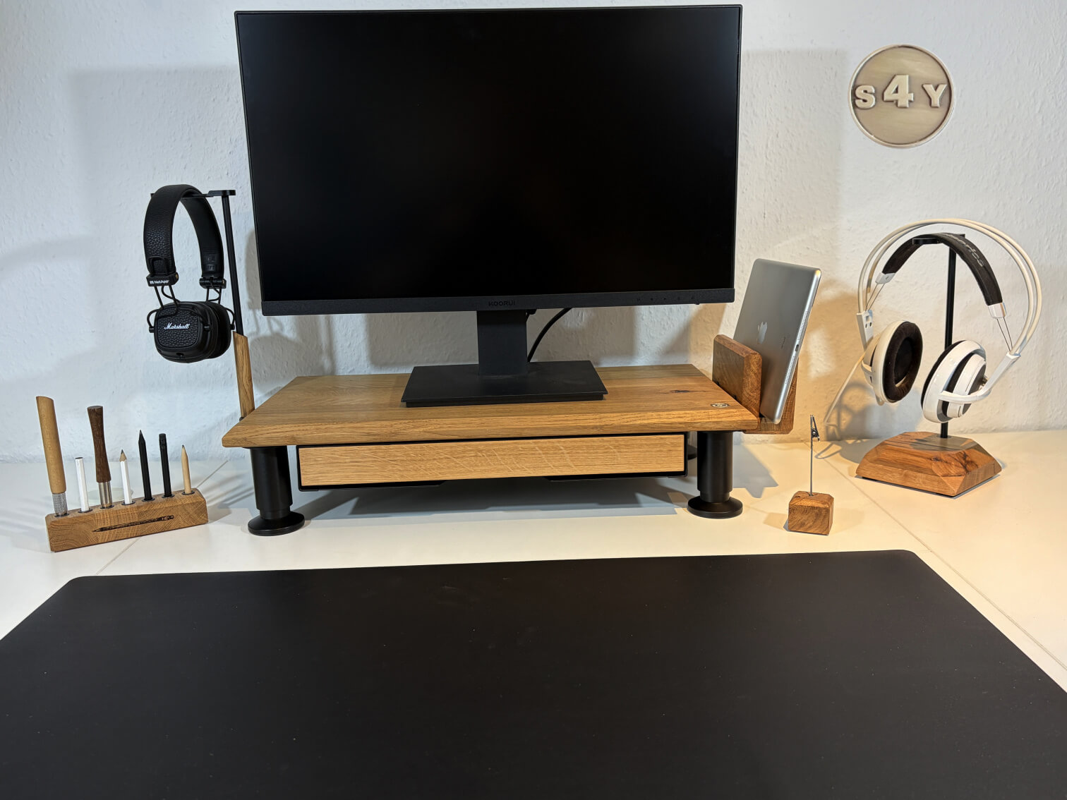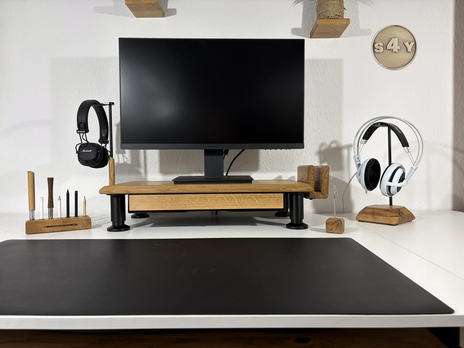 Es ist für Widescreen-Monitore, Notebooks, sowie Laptops oder andere Bildschirme geeignet. Es hilft dir deinen Nacken zu entlasten, welcher oft unter der Bildschirmarbeit leidet. Außerdem sorgt er mit seinem minimalistischen Design auf jedem Schreibtisch für ein besonderes Statement und verschafft ein neues Level von Struktur und Ordnung. Durch die breite, massive, rustikale Eichenoberfläche und den gefasten Kanten ist diese Monitorerhöhung ein Blickfang und Hingucker in jedem Büro und jeder Wohnung. Die schwarzen Aluminiumfüße sind gebürstet und höhenverstellbar, sehen nicht nur edel aus, sondern sind auch noch sehr funktional. Ein bodenschonender Gleiter aus Kunststoff schützt den Schreibtisch vor Kratzern. Bei dem COCKPIT-S4Y Spezial ermöglichen die Aluminiumfüße einen stufenlosen Ausgleich um bis zu 15 mm. Erhöhe deinen Monitor, Laptop oder kleinen Fernseher zu deiner passenden und angenehmen Betrachtungshöhe und erreiche so mehr Komfort und eine bessere Sicht. Optional ist es möglich unter den COCKPIT-S4Y Spezial die Unterbauschublade S-12 mit praktischem Fach für Aufbewahrung von verschiedenem Bürozubehör zu montieren. Sie können sogar den freien Platz unter der Schublade gut nutzen, um z. B. Ihre Tastatur oder andere Dinge aufzubewahren! Die offene Vorder- und Rückseite erlaubt schnellen Zugang zu Kabeln und Schaltern.