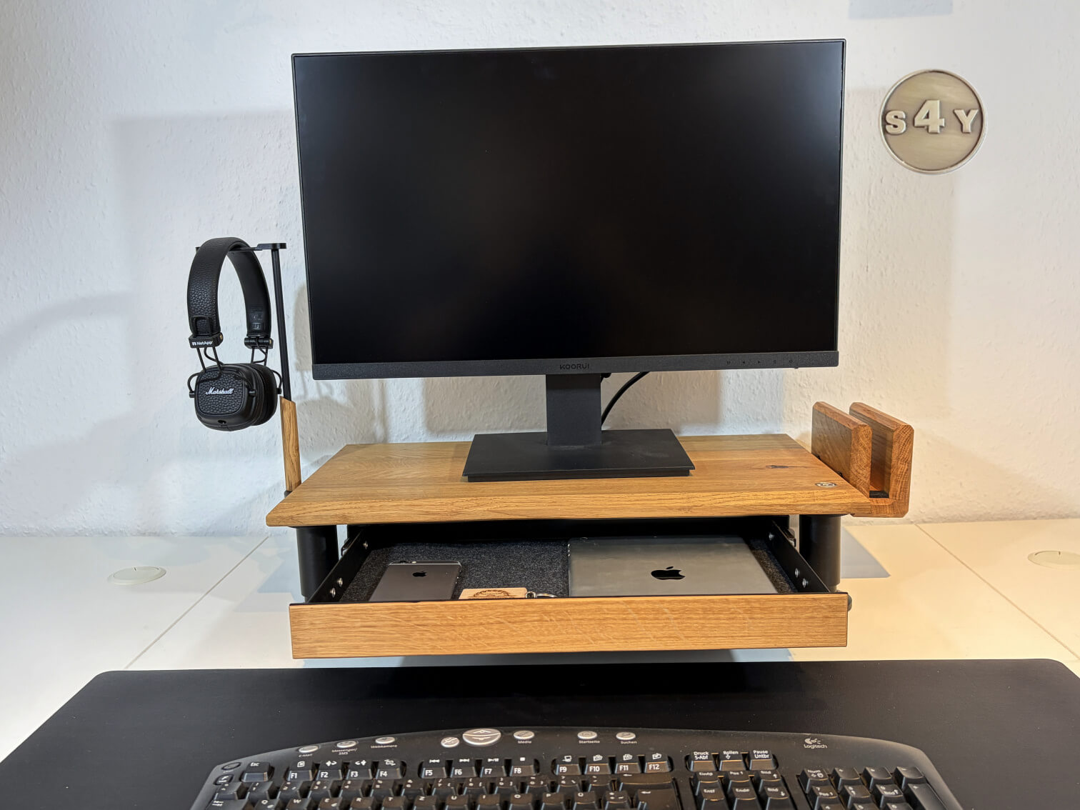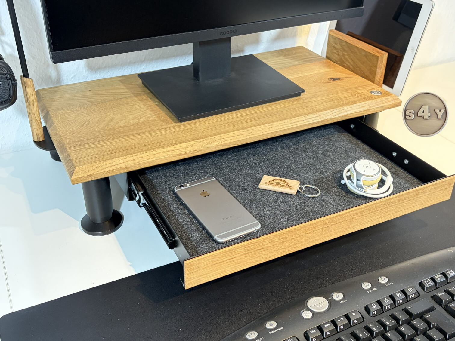 Das COCKPIT-S4Y Spezial aus rustikaler Wildeiche Asteiche ist eine ausgefallene Bildschirmerhöhung und verbindet Funktionalität und Ästhetik miteinander.