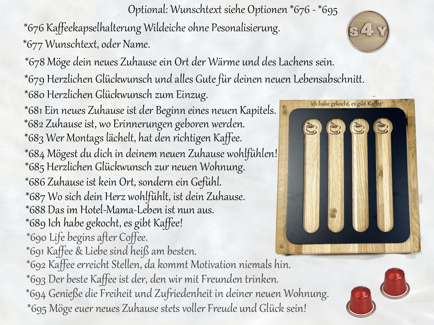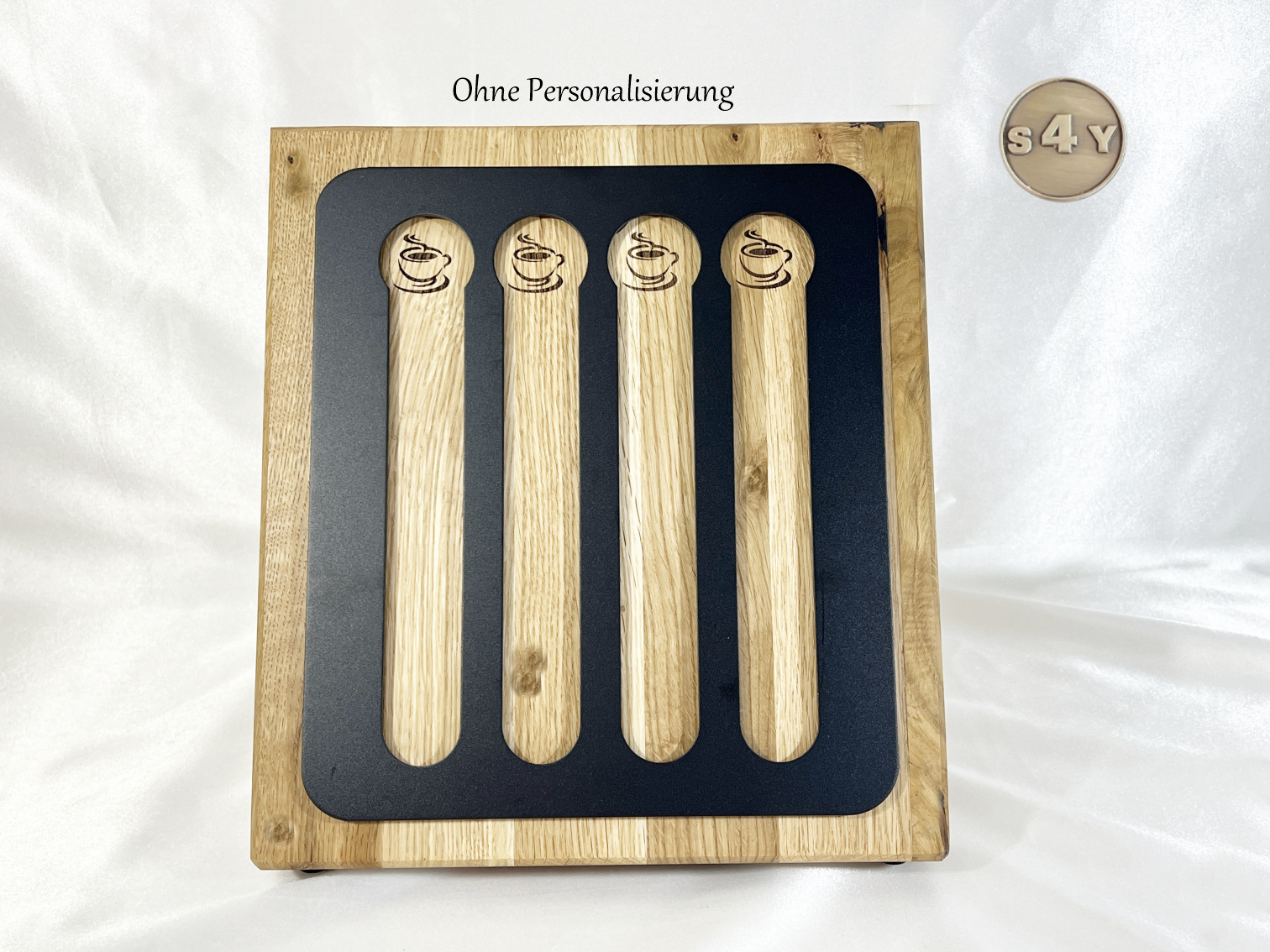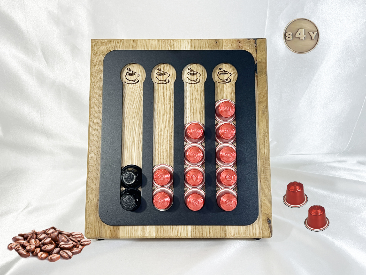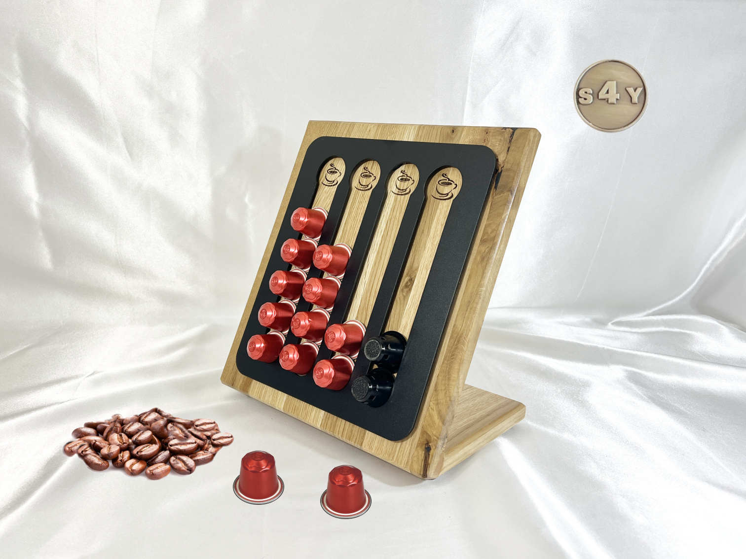 Kaffeekapselhalterung in Wildeiche für Original Kaffeepads, in Flachregal Turmregal zur Aufbewahrung von 24 Kapseln in schwarz mit Personalisierung Name. Dieser hochwertige spezielle Kapselhalter aus Aluminium und Wildeiche massiv sorgt nicht praktisch für Ordnung, sondern zeigt auch für eine stilvolle Ambiente in jeder Einrichtung oder Küche. Die schwarze Metall Oberfläche und die Wildeiche machen ihn zum Highlight neben deiner Kapselmaschine.